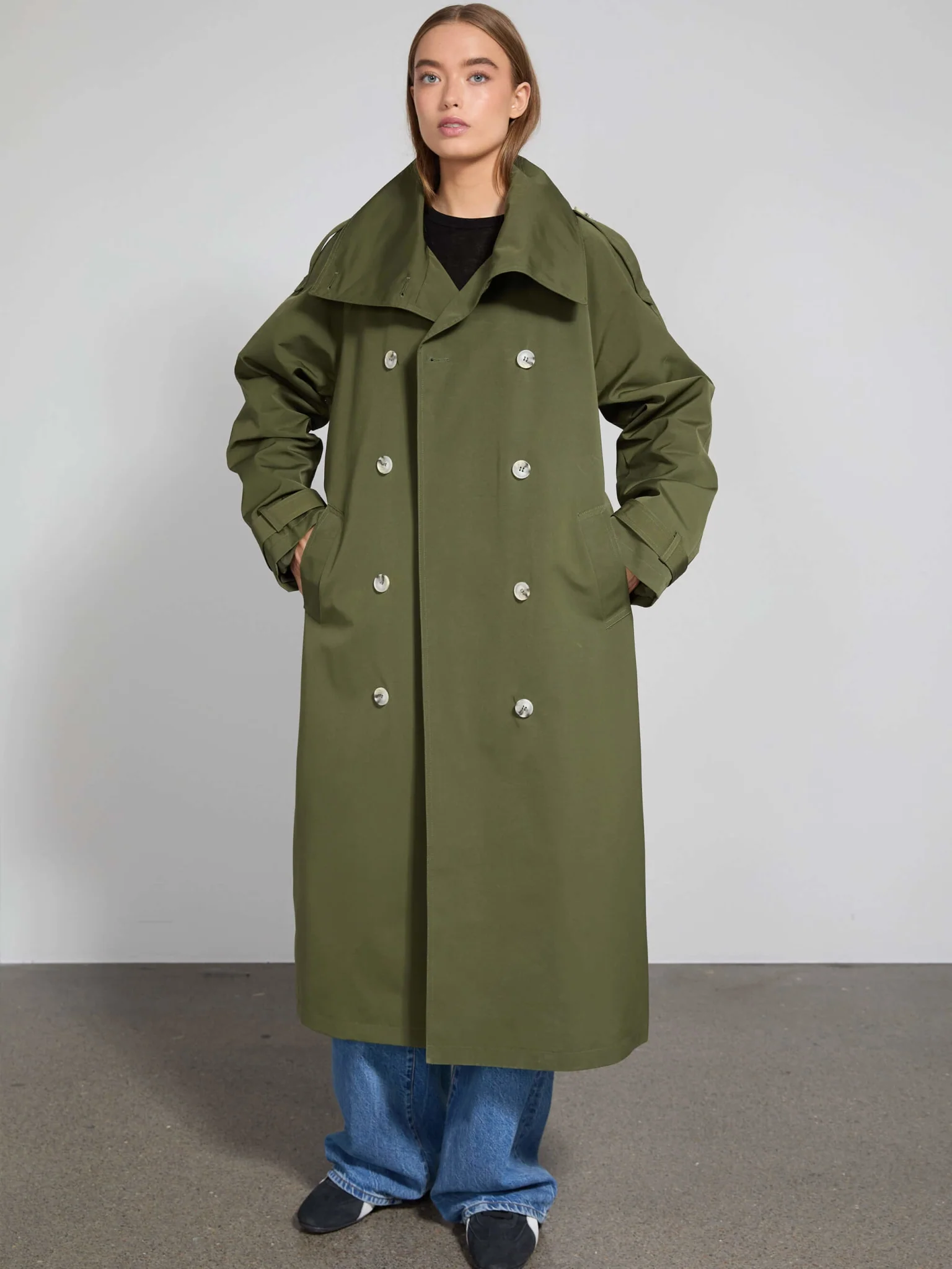 An oversized, menswear-inspired trench coat made from a fully lined, lightweight nylon fabrication offering a water-repellent feature. Bello Coat is designed with a double-breasted button closure, wide collar, shoulder epaulettes, sleeve straps and a belt to highlight the waist.