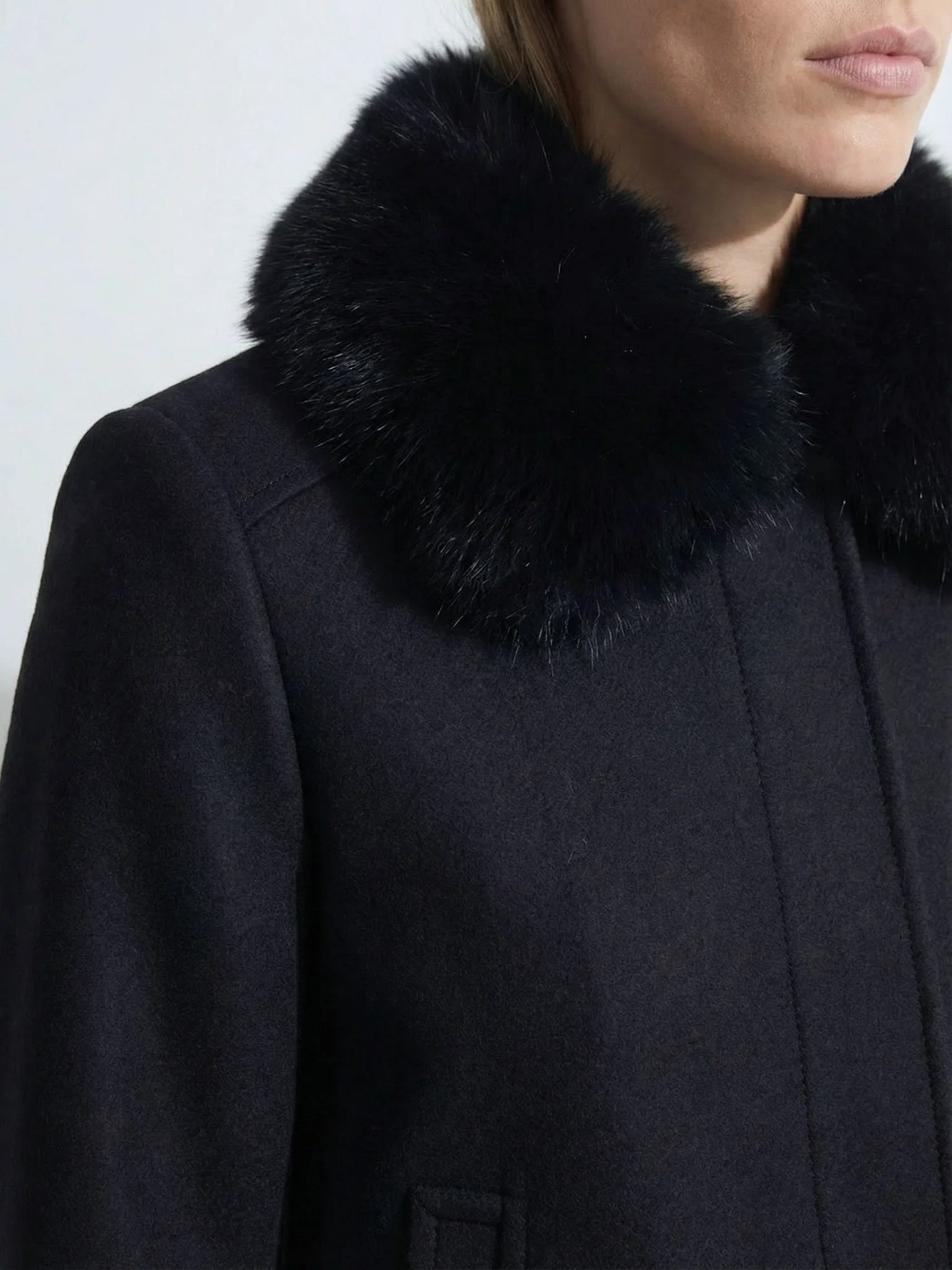 The Daisy Jacket is crafted from a soft wool blend, finished with a faux fur collar and matching cuffs. Featuring a slightly tailored silhouette, it includes a concealed front button closure for a seamless look. Plush faux fur detailing highlights the neckline and sleeves for a chic, refined finish. An elevated outerwear piece with timeless femininity.