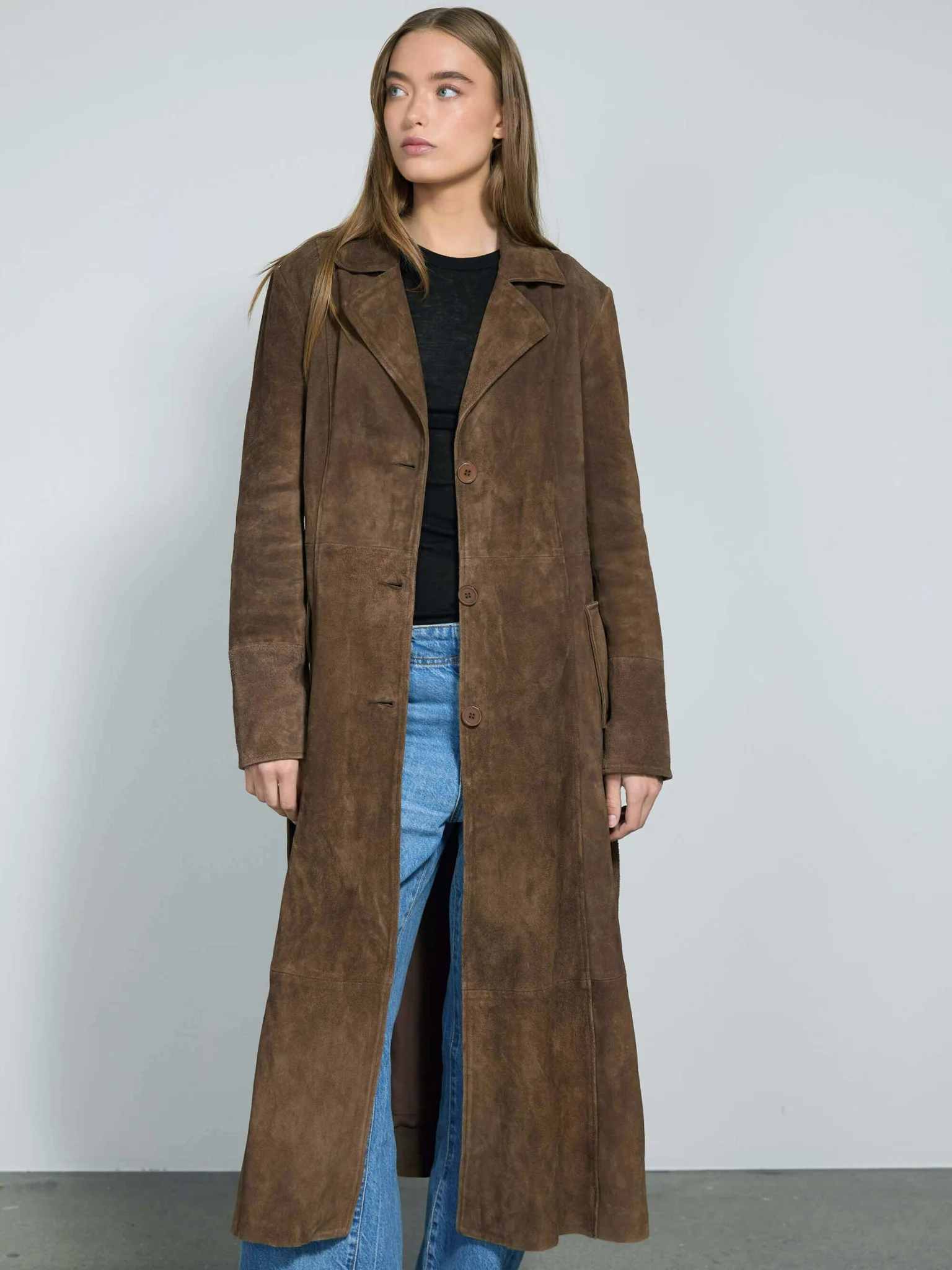 Turn heads with every step in a coat that demands attention. Drew Coat is crafted in fully lined, 100% soft suede leather making it the perfect style for transitional seasons. It features a single-breasted button closure, lapel collar, two welt pockets and beautiful, all-around stitching. Highlight your waist with the detachable belt for a modern feel. Drew Coat is a tailored jacket that fits true to size for a sleek, polished look. For an oversized look we recommend sizing up.