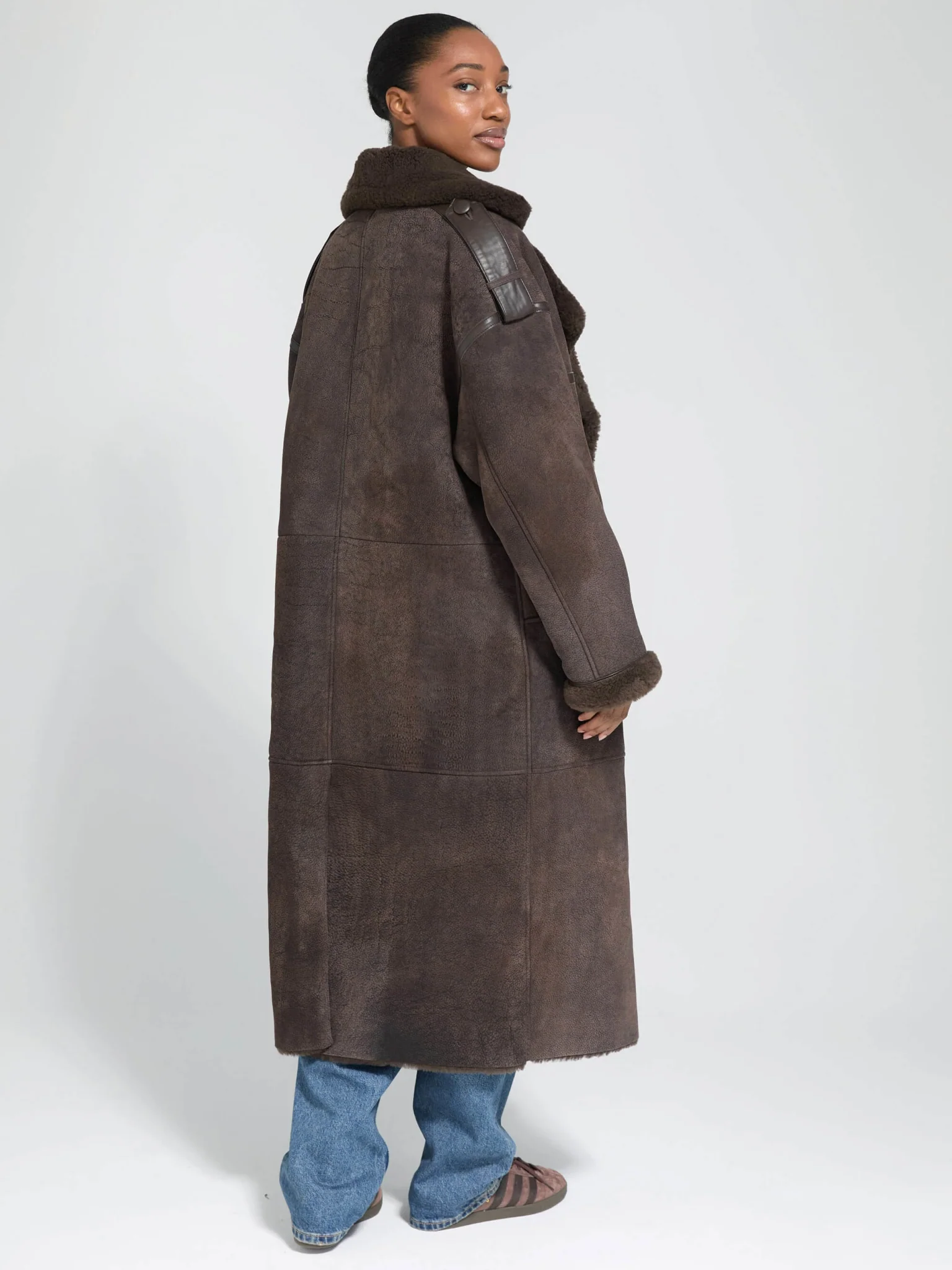 The Grace is a double-breasted full length coat in brown leather with matching brown shearling notch lapels. It is shaped to an oversized, drop shoulder silhouette, designed with leather buttons, two open front pockets, and shoulder details in brown leather.