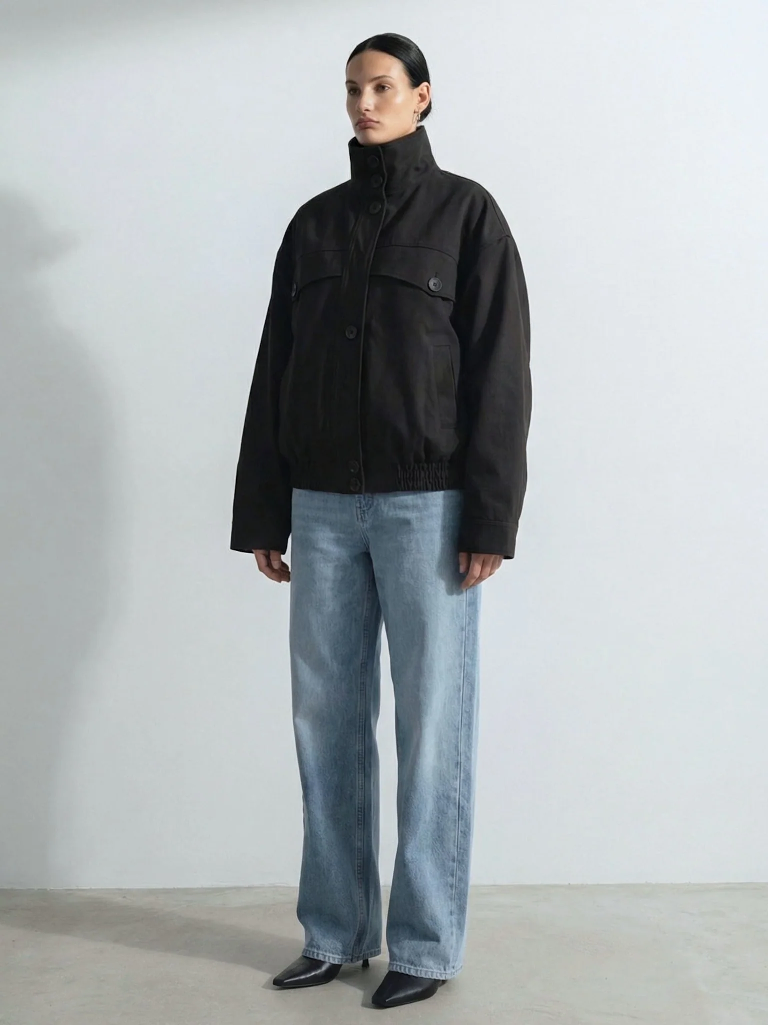 The Nori Bomber Jacket is crafted from structured cotton with a durable, matte finish. Designed in an oversized silhouette with volume through the body and sleeves, it features a high stand collar and a front button closure. Flap chest pockets add subtle utility detailing, while an elasticated hem creates a balanced shape. A modern bomber with a clean, effortless expression.
