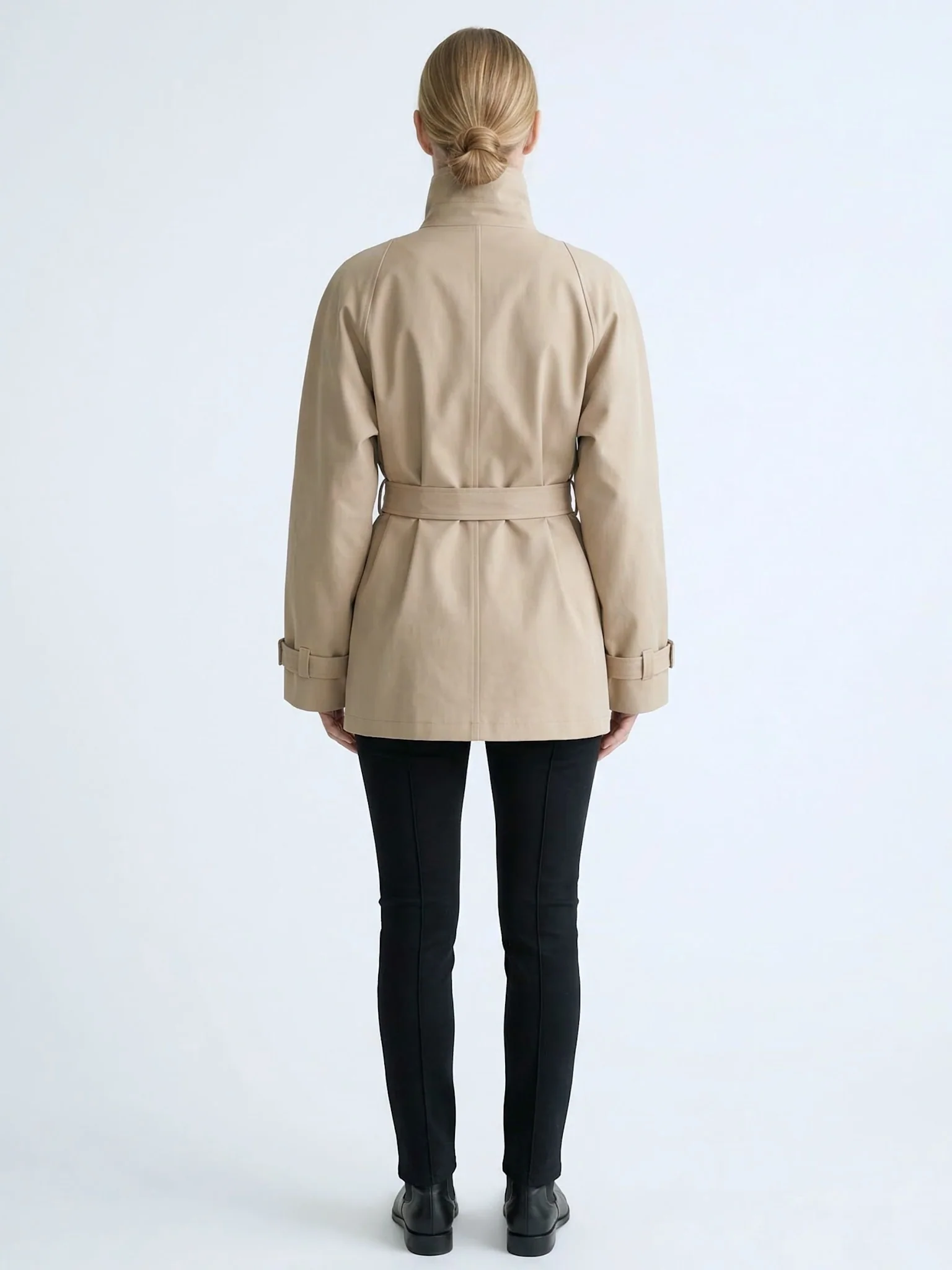 A Modern take on the classic trenchjacket is crafted for a clean, contemporary look with a high collar and button-down front. It features two practical pockets and a waist-defining belt, allowing you to cinch for a tailored silhouette or wear loose for effortless fit.
