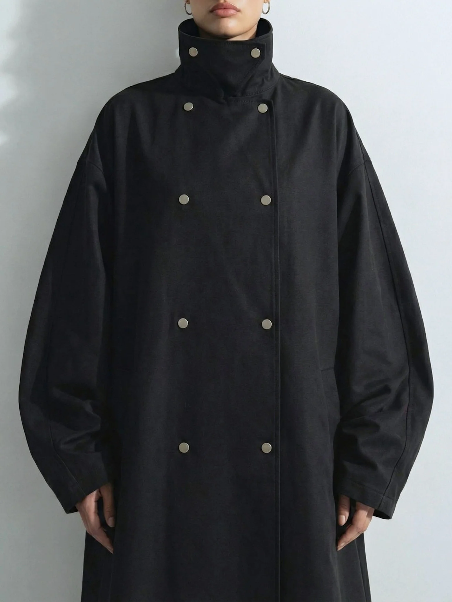 The Solan Coat is crafted from structured cotton with a smooth, matte finish. Designed in an oversized silhouette with exaggerated volume through the body and sleeves, it features a sculptural funnel neck and a double-breasted front with snap buttons. Cut to an ankle-length it creates a bold, elongated shape with a clean, architectural expression. A statement outer layer defined by modern minimalism.